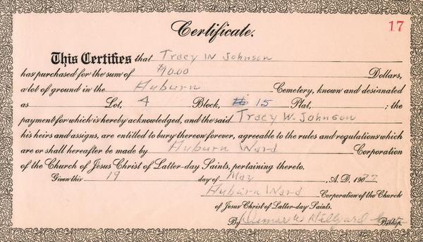 (Mouse over any thumbnail below to see a larger image of the headstone or deed.)